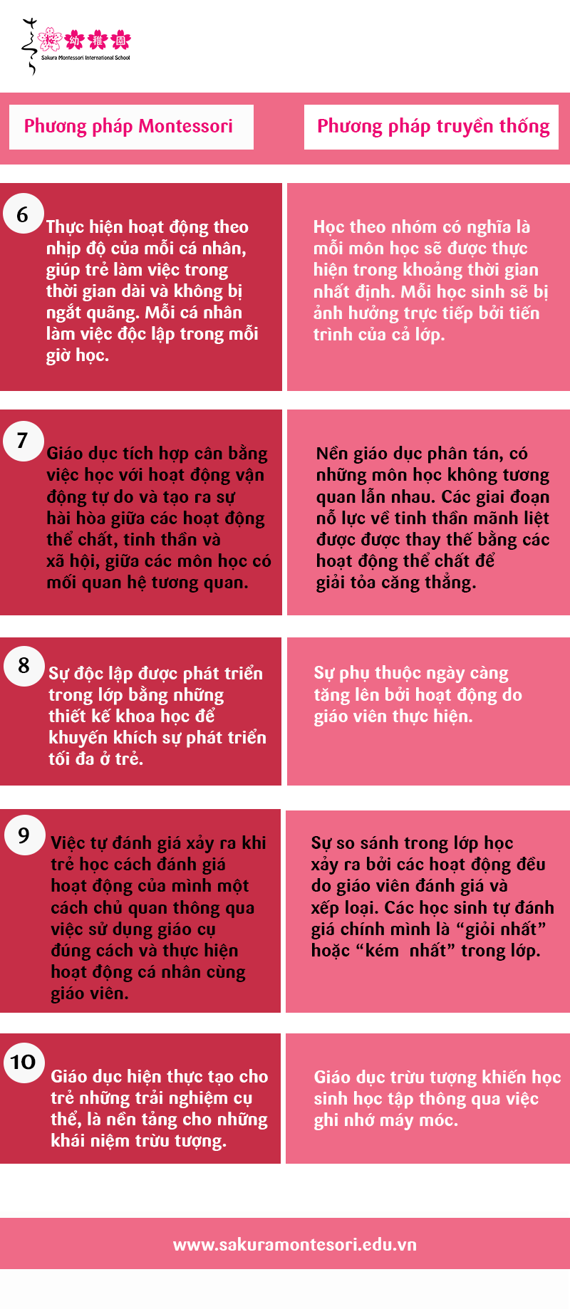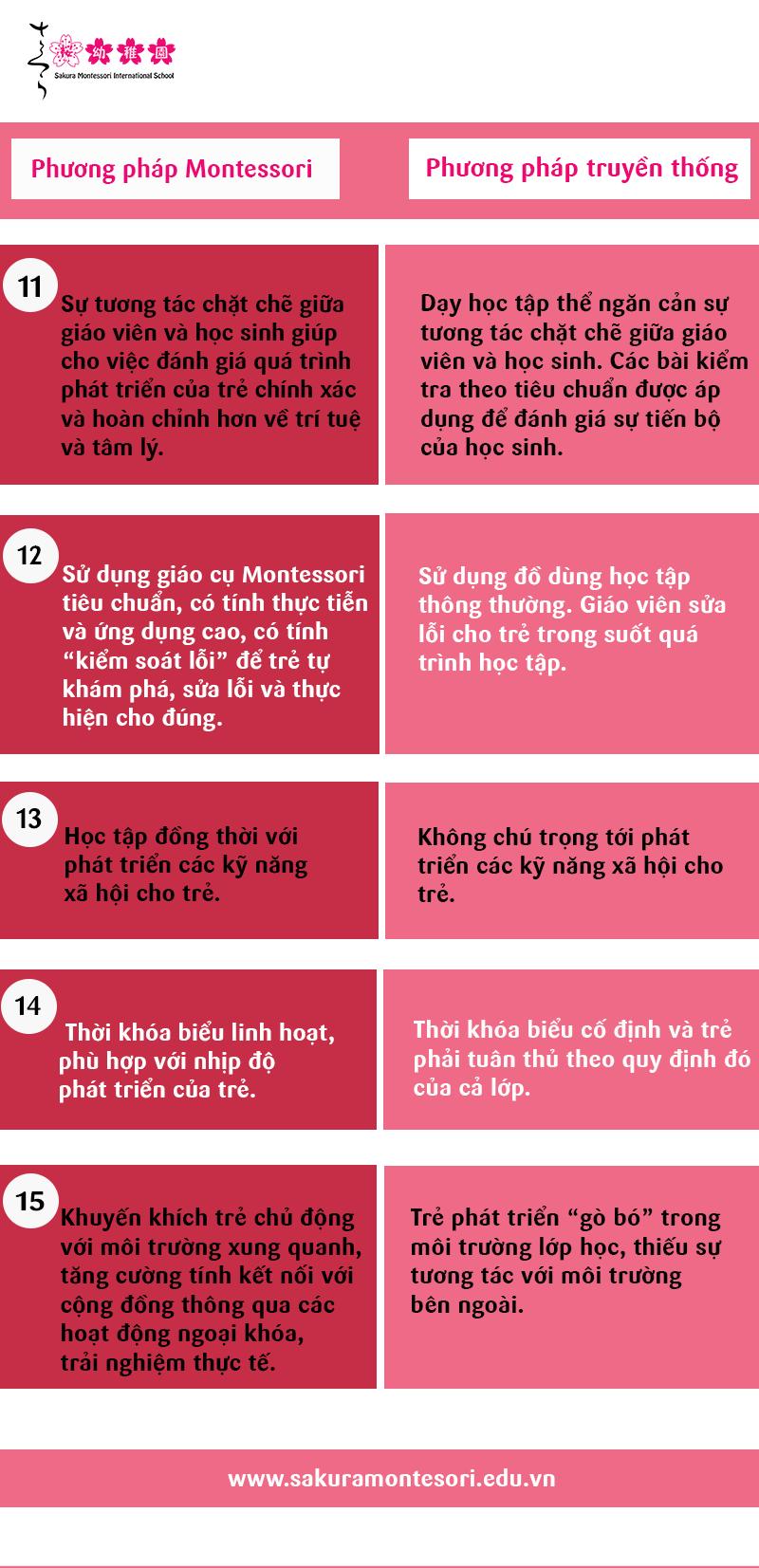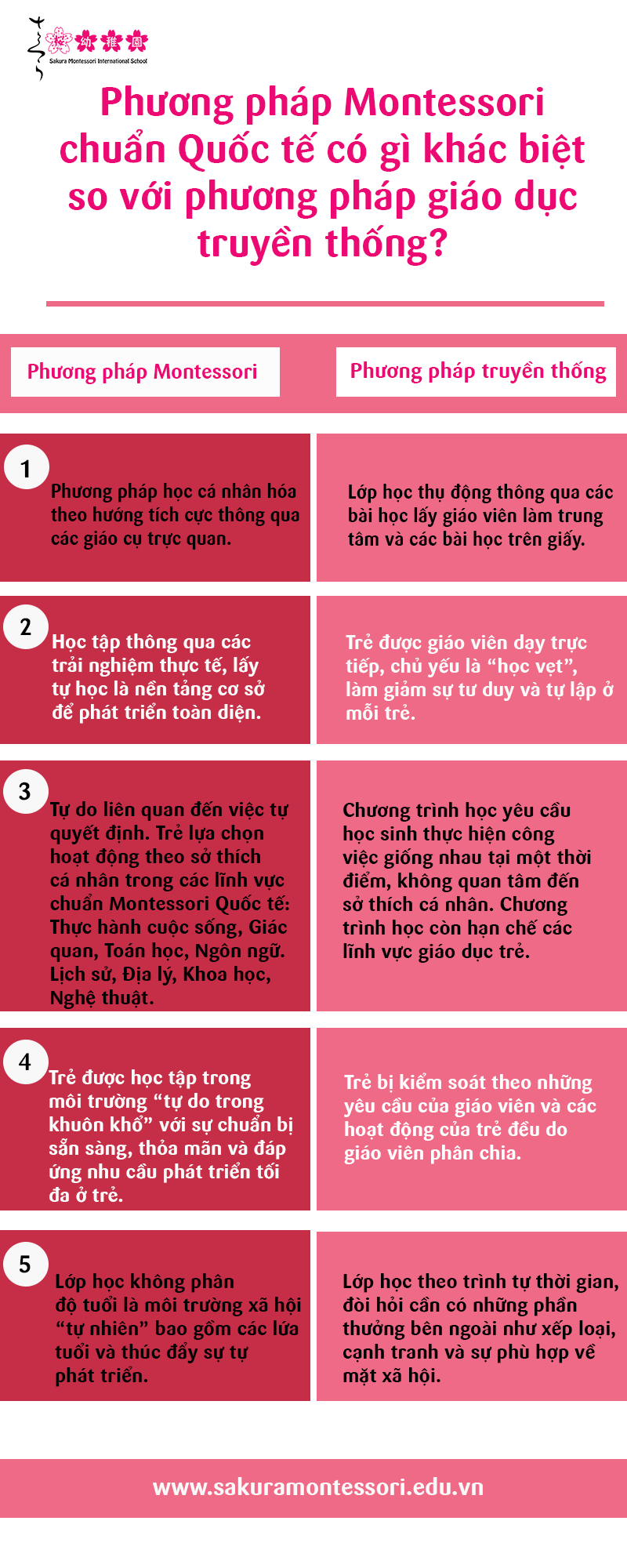 So với các phương pháp giáo dục truyền thống, phương pháp Montessori có sự khác biệt và mang lại nhiều hiệu quả hơn cả. Đó là những điểm mới lạ nào? Ba mẹ hãy cùng theo dõi trong bảng so sánh ngay dưới đây nhé!